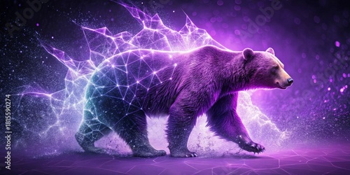A majestic purple bear strides through a vibrant cosmic network, its powerful presence illuminated by ethereal energy