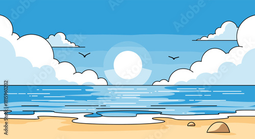 A serene and minimalist cartoon illustration of a peaceful beach scene with a bright sun calm ocean waves and fluffy white clouds.