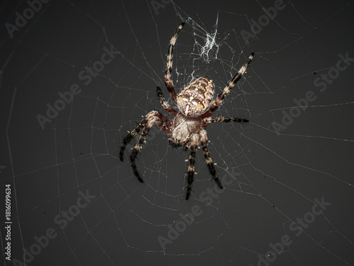 Pająk krzyżak ogrodowy na pajęczynie - makrofotografia Opis: Szczegółowe ujęcie makro pająka krzyżaka (Araneus diadematus) siedzącego w centrum swojej sieci. Pająk jest na ciemnym, jednolitym tle