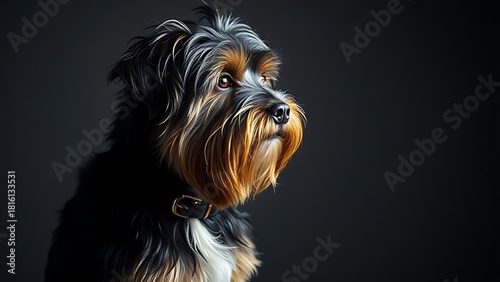 A calm Tibetan terrier dog sitting in profile, highlighted by dramatic side lighting against a simple soft background.