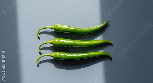 Three fresh green chili peppers arranged in a neat row on a minimalist gray background, illuminated by direct sunlight that creates strong, graphic shadows and a modern aesthetic