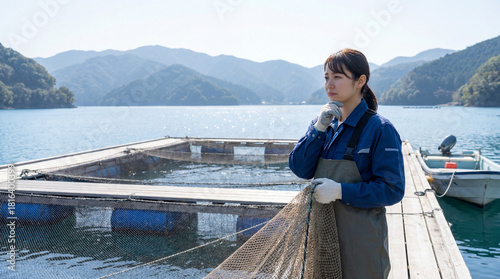 養殖網を点検する若手日本人女性水産技術者