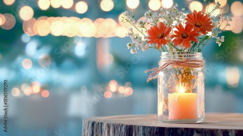 A close-up shot of a mason jar filled with orange daisies and white baby's breath, with a lit candle inside. The jar is tied with twine and sits on a rustic woo