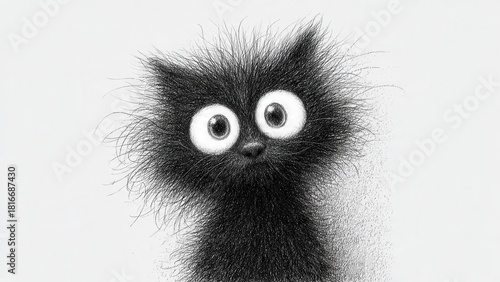Whimsical black cat with exaggerated, fluffy fur and large eyes, rendered in grayscale