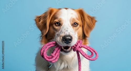 A cute and obedient pet dog with brown and white fur looks straight ahead while holding a bright pink rope style leash in its mouth, eager for an outdoor walk and adventure
