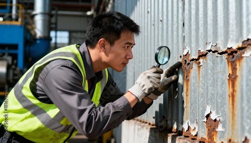 Technician closely examines metal siding on industrial factory wall inspecting for corrosion and surface damage in bright daylight.