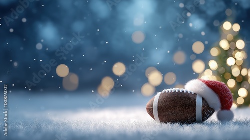 American football on snowy field with small decorated Christmas tree, Santa hat on the ball, soft glowing fairy lights, minimalistic composition, blurred background, space for text