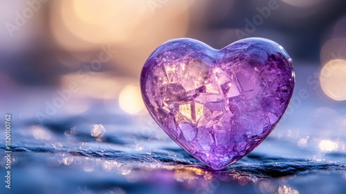 Heart-shaped amethyst crystal, warm sunset bokeh background, close-up, beauty