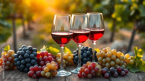 chardonnay. Two wine glasses among ripe grapes on a rustic table, bathed in soft afternoon sunlight. bar promotions, beverage menus, designed for product packaging and bar promotions.