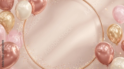 A festive arrangement of balloons in pastel shades, surrounding a circular frame on a soft pink background, perfect for celebrations and events.