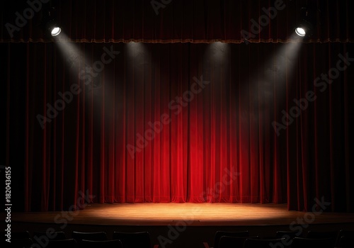 Grand theater stage illuminated by dramatic spotlights and rich red velvet curtains creating a theatrical mood ,curtain ,entertainment ,hall