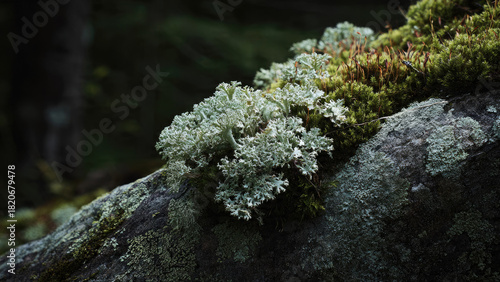 Light green lichen and dark moss thrive on a textured rock in a serene forest, highlighting nature's intricate macro beauty.