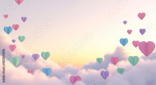 Whimsical Valentine's Day scene, floating paper hearts in pastel colors, cotton candy clouds, generous empty sky area in the upper half, magical fairy-tale vibe, soft focus"