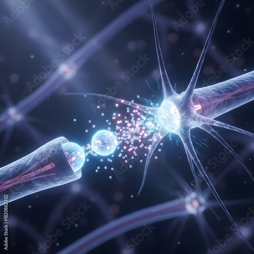 Macro Visualization of Synaptic Connection Between Neurons – Glowing Neurotransmitters and Neurology Science Illustration