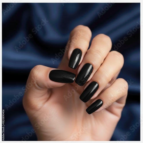 Close-up of a hand with long black glossy acrylic nails against a smooth blue background, showcasing bold manicure style.