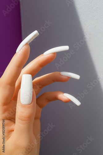Close-up of a hand with long white glossy acrylic nails against a smooth blue background, showcasing elegant manicure style.