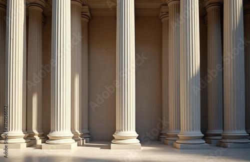 Neoclassical white pillars align perfectly creating symmetrical architectural backdrop. Strong, sturdy columns evoke grandeur, timeless design. Balanced order, precision define majestic structure.