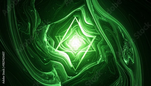 輝く光と菱形フレームが中心に配置された深緑の抽象的な流動模様が広がる神秘的な空間