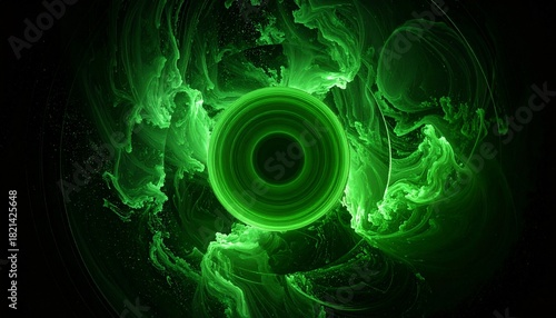 暗闇の中央で緑色の光を放つ同心円が神秘的なオーラを放ち周囲に幻想的な流体と微粒子が広がる空間
