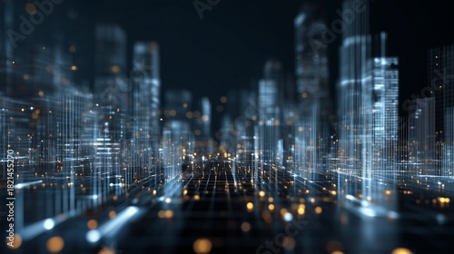 Abstract cityscape of illuminated skyscraper model made of digital light points representing data governance, policy, architecture and secure information flow.