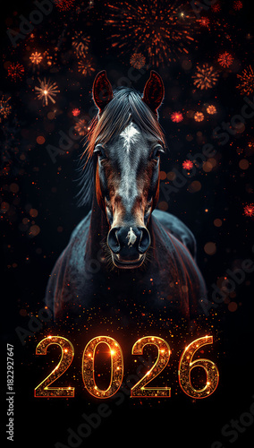 幸せな新年をテーマにした2026年向け馬と黒背景の上品で落ち着いた縦長構図. 生成AI