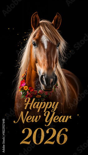 2026年の新年挨拶状や招待状に最適な馬と黒背景のエレガントな縦長デザイン. 生成AI