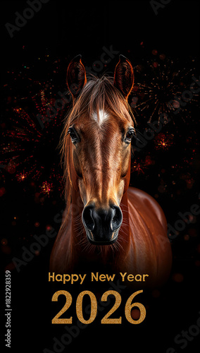 幸福感のある馬のシルエットを黒背景に配した2026年新年向けシックな縦長カード. 生成AI
