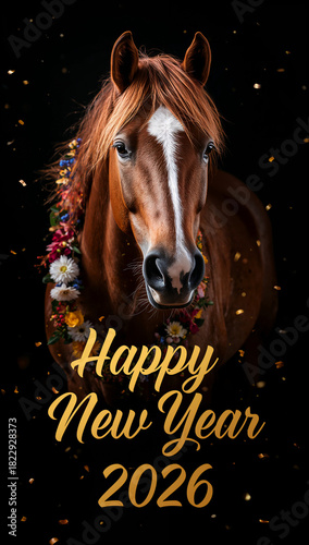 幸せな表情の馬と深い黒背景が2026年の新年メッセージを上質に彩る縦画像デザイン. 生成AI