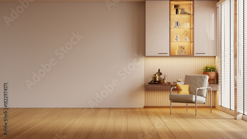 A modern cozy reading corner featuring a comfortable armchair, warm built-in cabinet lighting, decorative vases, plants, and wooden flooring- 3D rendering