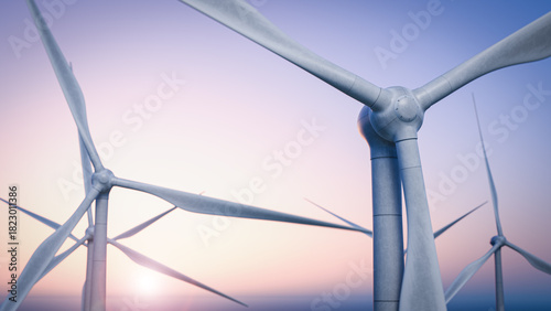 Rotating wind turbines. Green energy. Renewable energy sources. Generating electricity from wind. Wind power plant. Caring for the environment. Generating clean electricity. 3d render