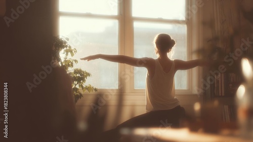 Young woman sitting on a window sill with her arms stretched out in front of her. she is wearing a white tank top and black leggings.