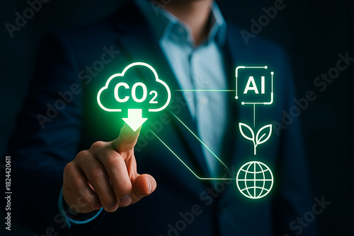 Businessperson with Carbon dioxide (CO2) symbol and AI technology for the concept of environmental conservation.