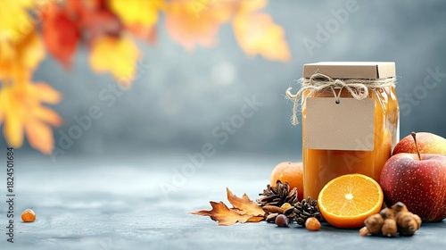 A glass jar filled with orange jam, tied with twine and a blank tag, sits on a textured surface surrounded by apples, an orange slice, pinecones, and autumn lea