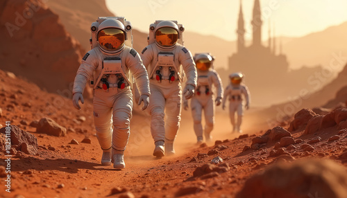 Astronauts in white space suits walk on red planet terrain with rocky hills, futuristic alien city in background. Team of space explorers on mission to explore extraterrestrial landscape. Space