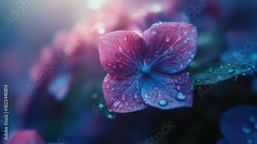 Vibrant hydrangea flower, morning dew, close up, nature background, stock photo