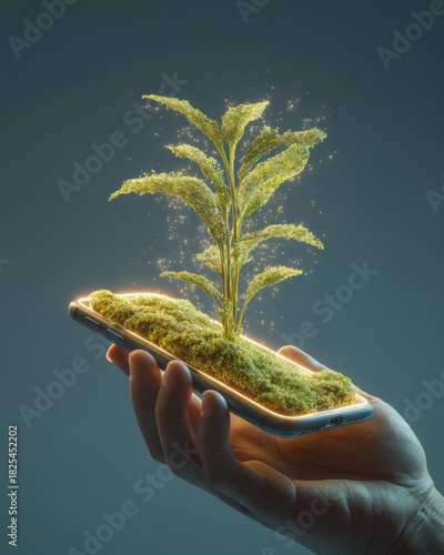 Hand holding smartphone with stylized plant growing from screen symbolizing sustainable technology innovation and environmental growth for eco tech and green innovation digital transformation concept.