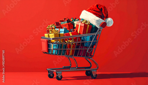 Un carrito de supermercado lleno de paquetes de regalo decorados con lazo, con un gorro de Papá Noel, aislado sobre fondo rojo para publicidad de compras de navidad