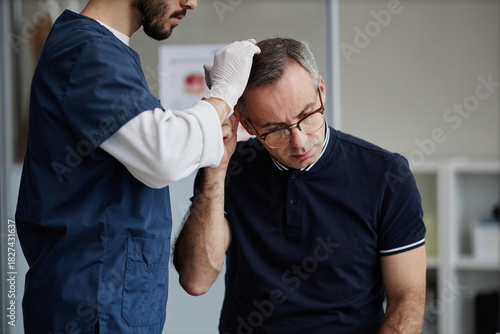 Middle aged Caucasian man receiving scalp examination from male healthcare professional wearing gloves during dermatology appointment, patient tilting head forward for inspection