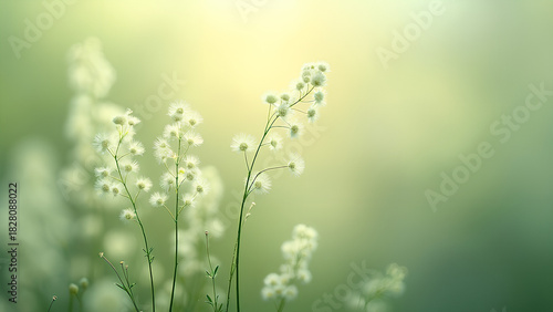 Sanft beleuchtete, abstrakte Komposition zarter, sich langsam wiegender Pflanzen, in der Luft schwebende Tautropfen, blassgrüne und elfenbeinfarbene Töne. KI Generated