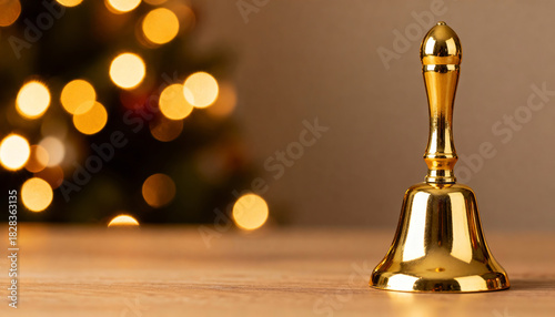 Gold hand bell standing on a wooden surface against a blurred Christmas tree background.