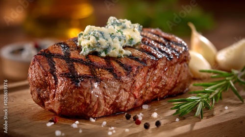 Grilled Steak with Herb Butter on Wooden Board Surrounded by Garlic Cloves and Fresh Rosemary in Soft Lighting for Culinary Delight