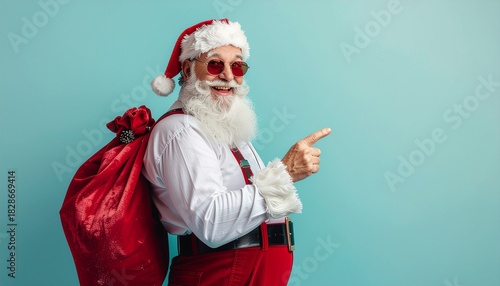 Święty Mikołaj z workiem prezentów na niebieskim tle wskazuje palcem w bok
