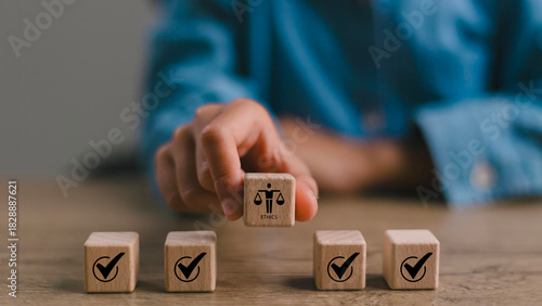 Ethical Assessment Concept. Placing wooden blocks with icons including checkmarks and a symbol of ethics, representing the evaluation and validation of ethical standards. Effective compliance.