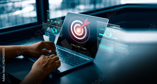 Digital target marketing and business goal strategy concept with person using laptop showing virtual target and analytics dashboard, symbolizing focus, achievement, and performance optimization