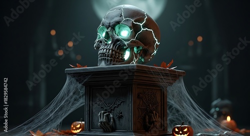 Eerie Glowing Skull Display with Jack-o'-Lanterns and Spiderwebs in a Mystical Halloween Cemetery Scene
