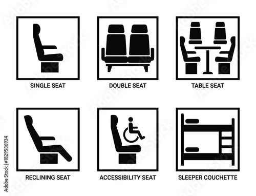 Set of seat icons depicting various types of seating arrangements for transport and public spaces