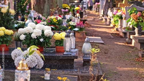 Christian Cemetery Grave Tombostones Decorated with Votive Candle Lanterns and Flowers on All Saints Day