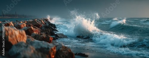 Waves crashing against rocky shore at sunset.