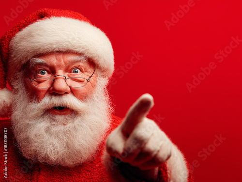 Święty Mikołaj w okularach, z zaskoczoną lub ostrzegawczą miną, wskazuje palcem w kierunku widza. Tło jest intensywnie czerwone, puste.
