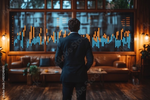 A businessman in a suit observes a large screen showcasing financial charts composed of blue and orange bars, representing market trends or investment analysis.